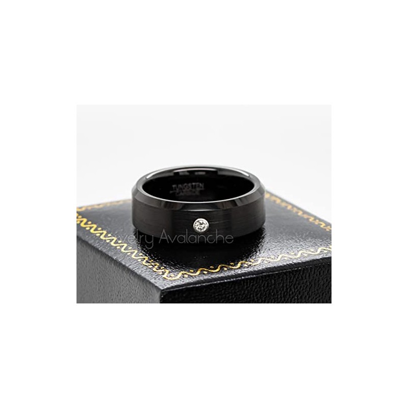 - 8MM Black BeveledTungsten Carbide Wedding Band with Bezel Set 0.07ctw Round Diamond Accent - Brushed Finish Comfort Fit Tungsten Anniversary Ring - Cobalt Free Tungsten Ring