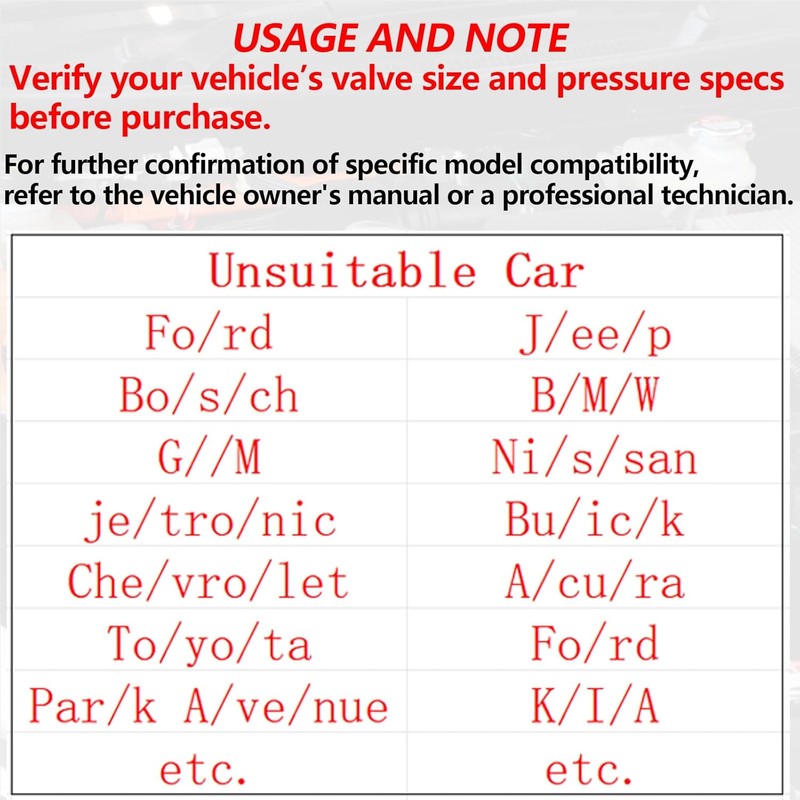 - Compatibility Note: For further confirmation of specific model compatibility, refer to the vehicle owner's manual or contact a professional technician. Excludes Fo/rd, K/I/A, Bo/s/ch, C/I/S Je/tro/nic, G//M Th/rot/tle Bo/dy Systems, A/cu/ra, J/ee/p, B/M/W, Ni/s/san, and To/yo/ta fuel systems. Not compatible with small/non/standard S/chra/der vallves, high/pre/ssure direct in/ject/ed engines, or die//sel injection pumps. Verify your vehicle’s vallve size and pressure specs before purchase