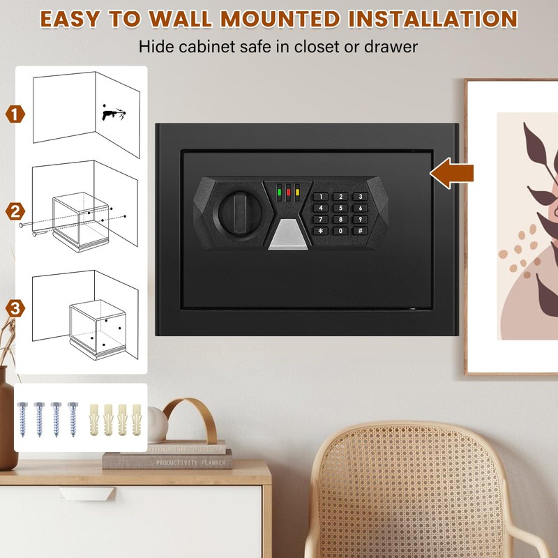 - 【FLOOR OR WALL MOUNTABLE】Our safe comes with 4 expansion bolts and pre-drilled holes for easy mounting on the floor or wall to prevent theft or movement. The classic black design makes it easy to hide in any corner of your home or office.