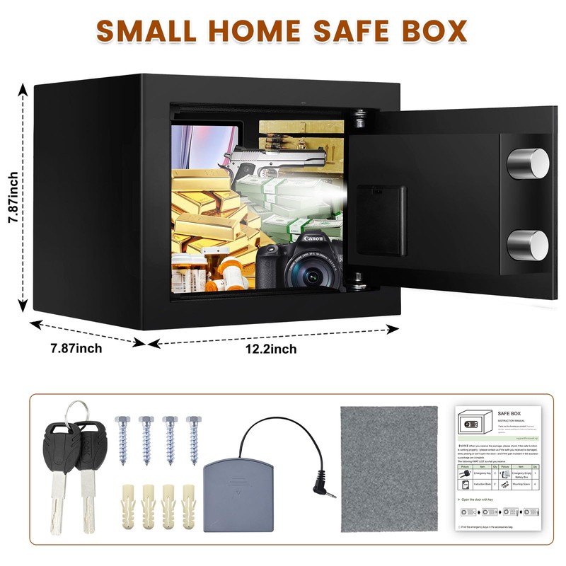 - 【SMALL PERSONAL SECURITY SAFE】The exterior dimensions of this small safe are 7.87‘*12.2’*7.87‘ and the interior dimensions are 7.5’ x 11.8‘ x 7.5’.0.40 cu. ft. capacity allows for the storage of small valuables, including jewellery, documents, passports, cash, etc.