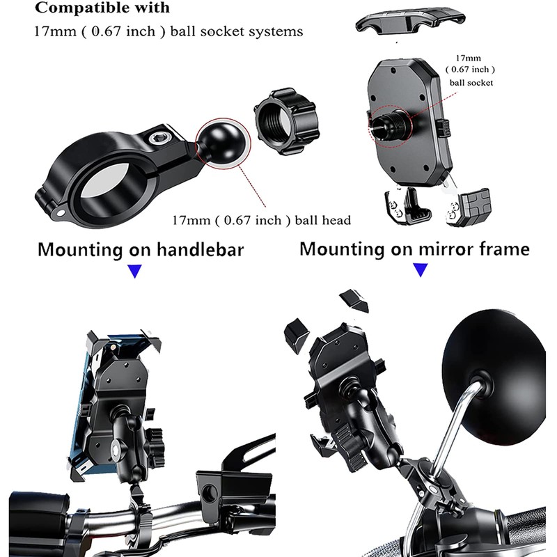 - ④ 0.67'' ball mount handlebar base compatible with RAM Mounts and socket component, including double socket arms, navigation mounts, action camera mounts, bike & motorcycle phone mount holders and others electronic device holders. Suitable for bike, bicycle, motorcycle, stroller, mountain bike, dirt bike, road bike, golf cart, electric scooter, ATV, etc.