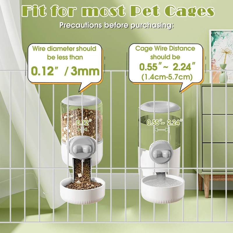 - The automatic cage cat food and water dispenser fit most cages, require 1. Cage Wire Distance should be 1.4cm-5.7cm/0.55”-2.24”; 2. Wire diameter should be less than 0.30cm/0.12”. Please measure your cage before ordering.
