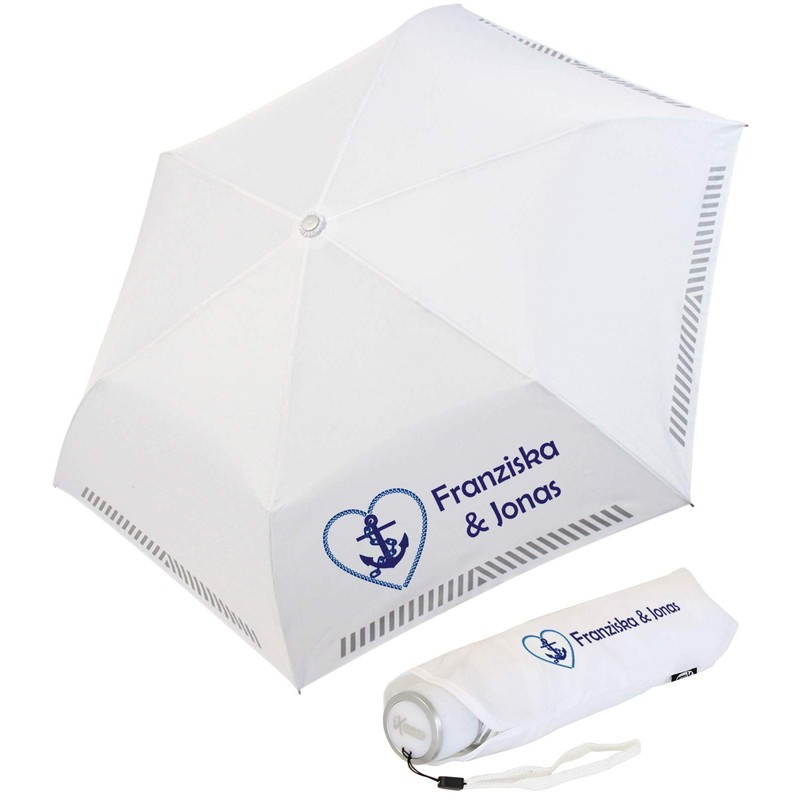 We print the umbrella and umbrella cover with the motif shown and the name of the wedding couple. Please use the "Customise Now" function at the top right of this page.