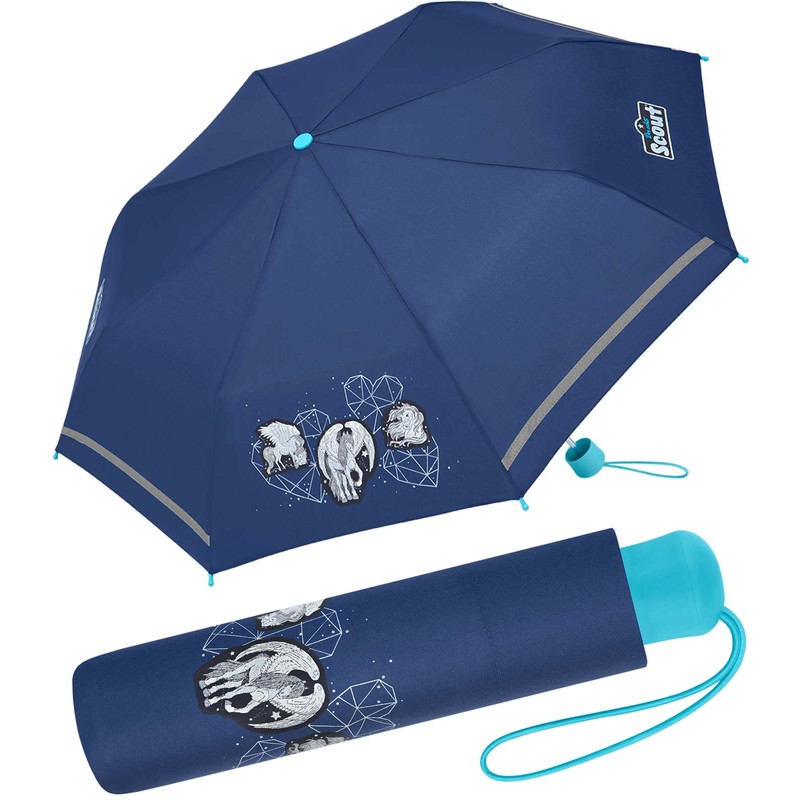 • Scout is one of the largest and safest school case manufacturers. Matching the school bag, there are now the small and lightweight pocket umbrellas in different designs, these printed with cute Pegasus motifs. With this pocket umbrella, your child is safely protected from any rain. The reflective strips on the edge of the umbrella immediately throw back light in the dark, e.g. from car headlights, and thus create a good safety effect.