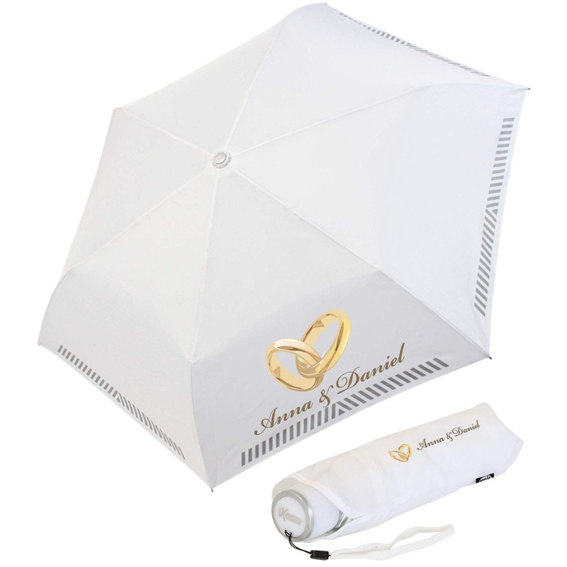 Wedding umbrella with rings motif and the name of the bride and groom.