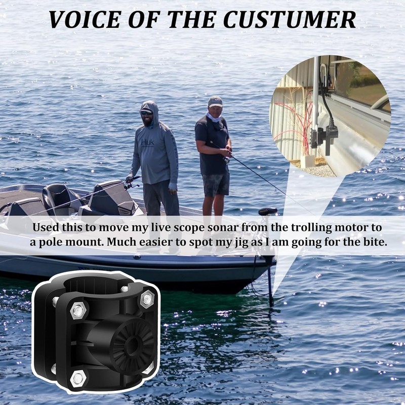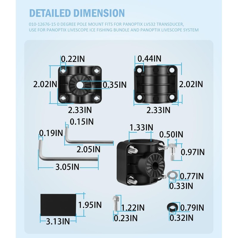 - Function: With this 0 degree pole mount you can place your transducer on it and adjust the angle of the transducer for the best viewing angle when ice fishing. The 0 degree mount is a great solution to the 8 degree offset problem, allowing the LVS32 to operate to its maximum potential, ensuring your lures remain visible in the sonar image, making it easier to track and adjust your fishing strategy.