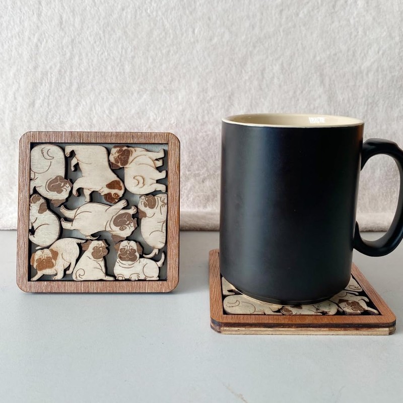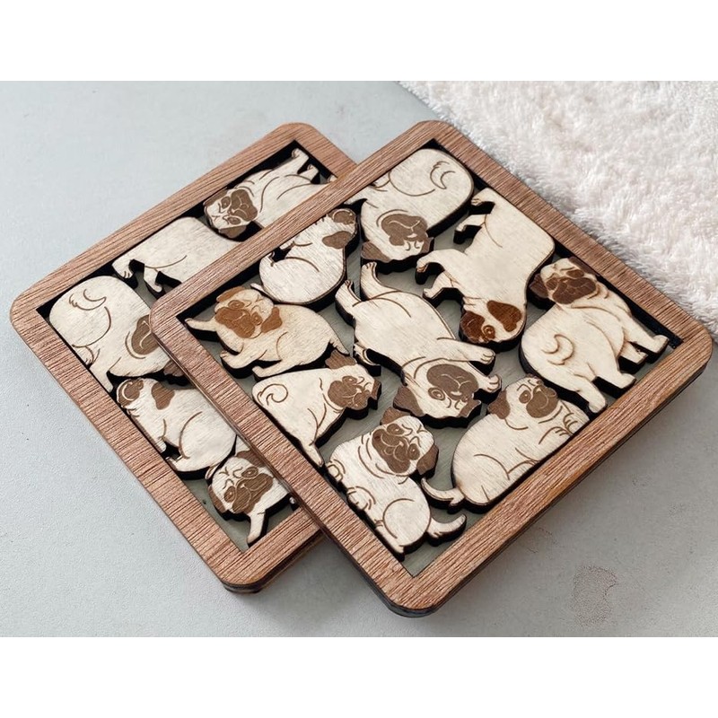 - Engage Your Mind and Protect Your Surfaces: Experience the perfect blend of practicality and play with our Pug Dog Puzzle Wooden Coaster Set. Designed for dog enthusiasts and puzzle lovers alike, this set offers a unique twist on the traditional coaster.