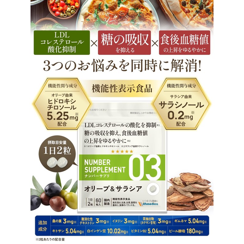 - ✅【商品区分】ナンバーサプリ03 ウィズメディカ オリーブサプリ サラシア サプリ 血糖値を下げるサプリ 食後血糖値下げるサプリ コレステロールを下げるサプリメント LDLコレステロール 悪玉コレステロール サプリ 糖の吸収を抑える サプリ サラシア 食後血糖値 機能性表示食品 ldlコレステロール下げる サプリ 糖の吸収 イヌリン 難消化性デキストリン カテキン 健康食品 血糖値対策 口コミ 桑の葉 ビール酵母