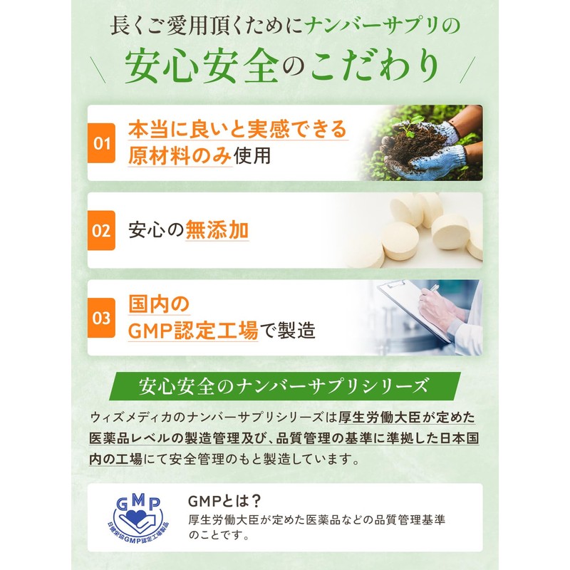 - ✅【国内の GMP認定工場で安心の無添加/全成分配合量を明記】ウィズメディカのナンバーサプリシリーズは徹底的に管理された日本国内のGMP認定工場で製造しています。香料、保存料、着色料、光沢剤などの添加物は一切使用していません。また、ナンバーサプリシリーズは成分配合量を表示しております。身体に入れるサプリメントを正しくご理解・ご納得頂いた上で長くご愛用頂く事が大切だと考えます。