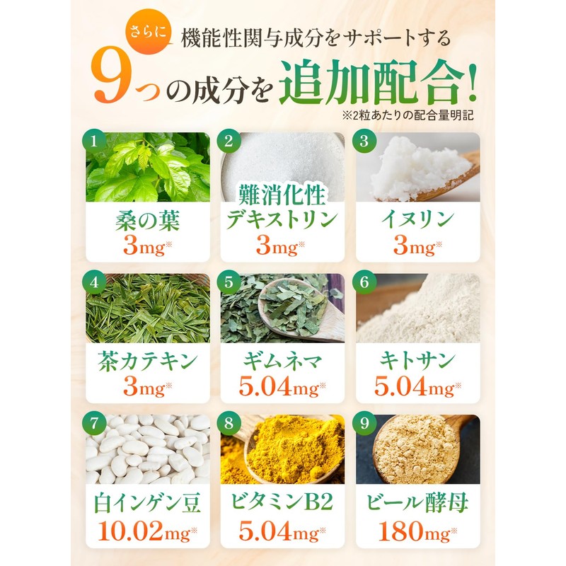 - ✅【機能性関与成分だけじゃない!贅沢配合の追加栄養補助成分】ウィズメディカ独自の追加栄養補助成分として桑の葉:3.00mg /難消化デキストリン:3.00mg /イヌリン:3.00mg / 茶カテキン:3.00mg /ギムネマ:5.04mg /キトサン:5.04mg /白インゲン豆:10.02mg /ビタミンB2:5.04mg/ビール酵母;180mgを贅沢に追加配合しています。機能性関与成分のみでなく追加栄養補助成分を加えることでより一層お客様の健康をサポートします。≪栄養成分表示≫2粒あたり(600mg) エネルギー:2.328kcal/たんぱく質:0.109g/脂質:0.02g/炭水化物:0.429g/食塩相当量:0.0018g