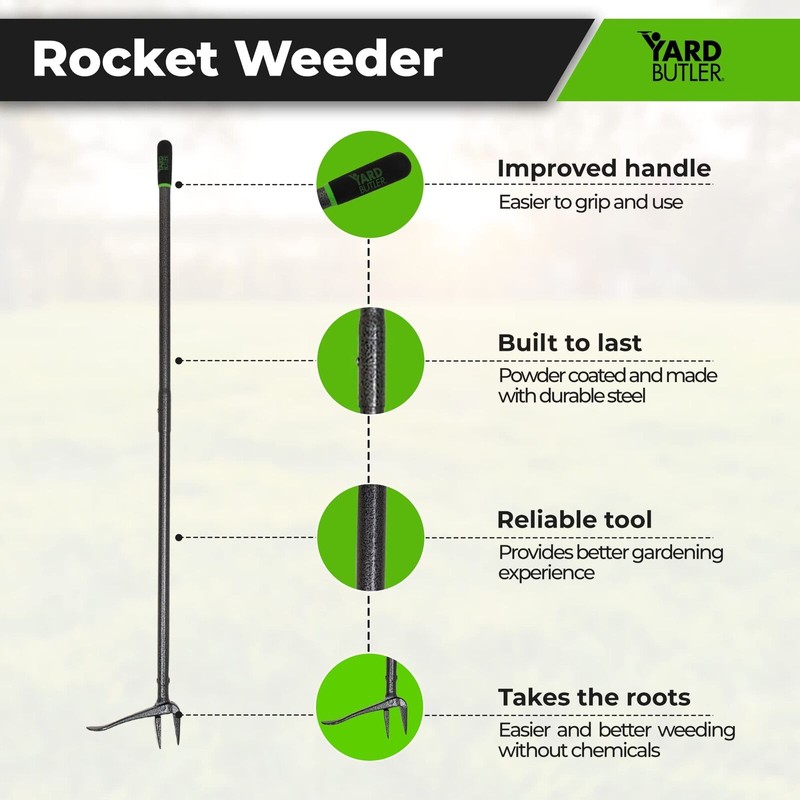 Introducing the Yard Butler Rocket Weeder IRKT-1000KDS, the ultimate dandelion and weed extractor tool for your lawn and garden. This handheld tool allows you to effortlessly pull weeds from their roots without ever having to bend over. Say goodbye to back ache and sore knees with our standup weeder tool. Its unique design makes it the perfect garden weed pulling tool, allowing you to easily extract even the toughest weeds with minimal effort. The Yard Butler Rocket Weeder is the perfect solution for any homeowner or gardener looking to maintain a pristine lawn. Featuring a comfortable grip and a sturdy build, our stand up dandelion puller is a must-have for any gardening enthusiast. The weeder tool for garden stand up is specifically designed to provide maximum leverage, making it easy to pull out weeds from any angle. Whether you're looking for a garden weed pulling tool or a dandelion puller tool stand up, the Yard Butler Rocket Weeder has got you covered. This weed puller tool is a reliable and effective solution for maintaining a beautiful and healthy lawn. Don't settle for a subpar weed puller tool. Choose the Yard Butler Rocket Weeder RKT-1000 for an efficient and comfortable gardening experience.