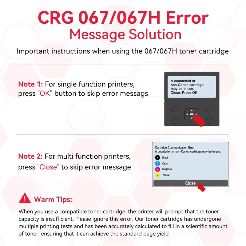 - 067 Toner Cartridge Set Compatible for Printers: 067 toner work with Canon Color ImageCLASS MF651Cw MF655Cdw MF657Cdw MF655Cw MF657Cw MF653Cdw MF654Cdw MF656Cdw and for Canon LBP631Cw LBP633Cdw LBP632Cdw series printer