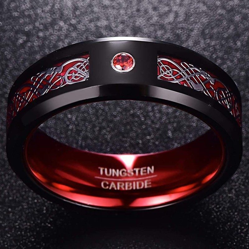083BASE Mens Dragon Pattern Tungsten Ring 8mm Width Cubic Zirconia Inlay Available in Blue, Black and Red - Tungsten Carbide Ring for Men, Tungsten Carbide