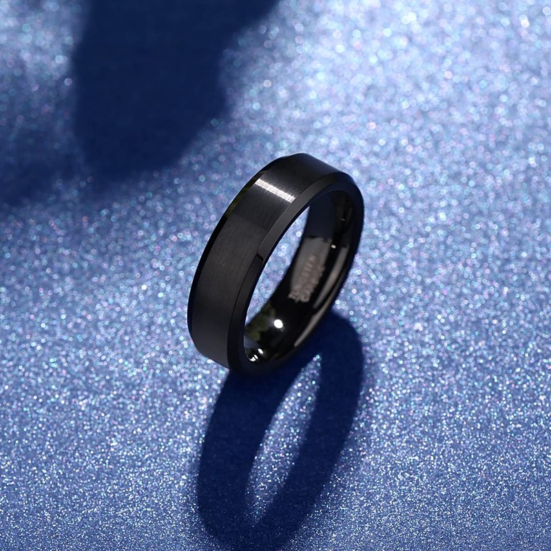 - Design: The ring features a matte black line in the middle, flanked by oblique cut edges. This matte line gives the ring a simple yet elegant appearance, while the polished side edges provide a striking contrast and make the ring an eye-catching accessory.