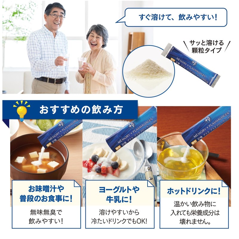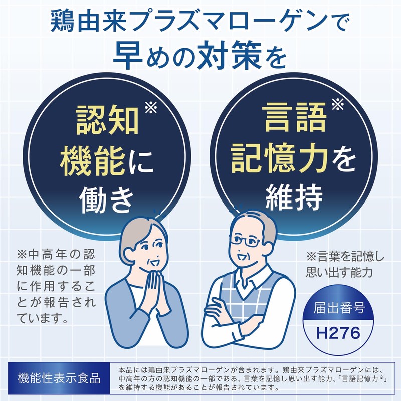 - 機能性表示食品 届出番号H267 本品には鶏由来プラズマローゲンが含まれます。鶏由来プラズマローゲンには、中高年の方の認知機能の一部である、言葉を記憶し思い出す能力、「言語記憶力」を維持する機能があることが報告されています。
