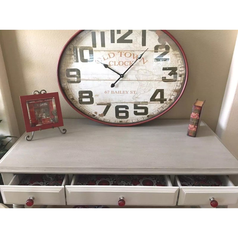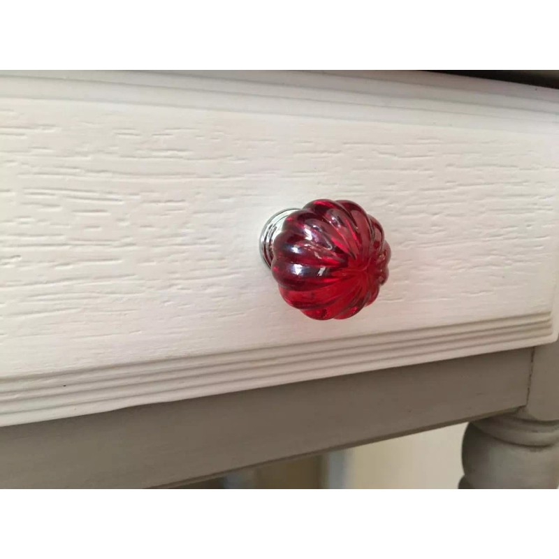 Chrome base with red acrylic ridged ball knob with pumpkin like features. This knob will add a touch of flavor and style to any home design. We are lucky and happy as can be to have photos of this cute red knob in use from Rejoice Recharmed on Facebook! Used on a nice desk makeover with an upholstered chair. I love the matching upholstery and knobs!