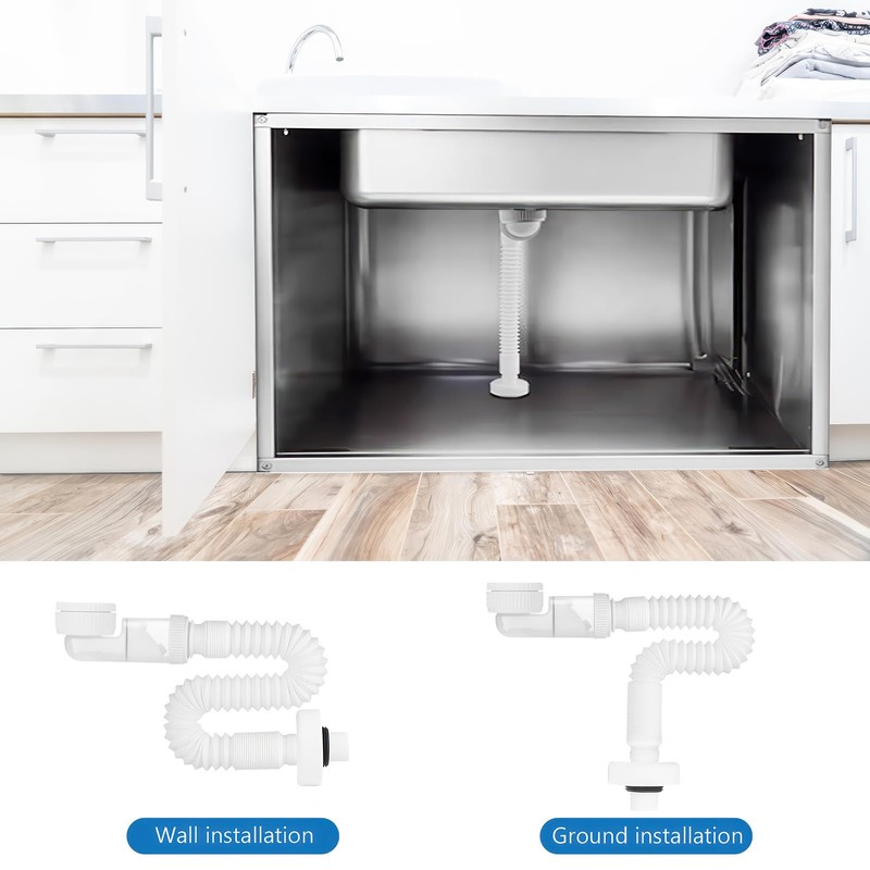 - 【Space-saving siphon with flexible length adjustment (38-93 cm)】The space-saving 1 1/4 inch siphon made of PP material stretches continuously up to 93 cm – ideal for sinks, suspended cabinets or unusual installation situations without wasting space due to rigid pipes.