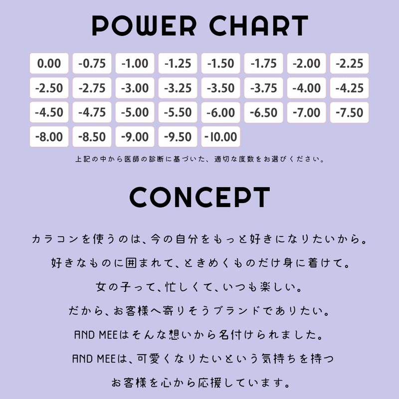 カラコンを使うのは、今の自分をもっと好きになりたいから。好きなものに囲まれて、ときめくものだけ身に着けて。女の子って、忙しくて、いつも楽しい。だから、お客様へ寄りそうブランドでありたい。AND MEEはそんな想いから名づけられました。AND MEEは、可愛くなりたいという気持ちを持つお客様を心から応援しています。