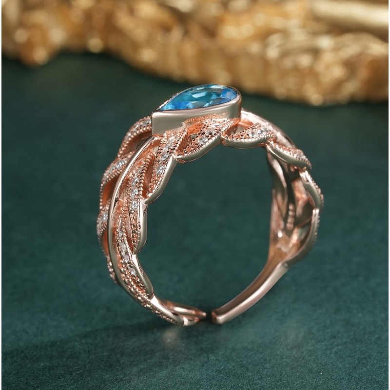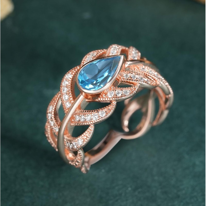 - Design Notes: Superbly styled Custom Designed Natural Blue Topaz "Feather" ring features a 1.1 carat pear cut solitaire highly facetted gemstone. Pave set in the band are clear high quality Austrian Zircon stones. Solid 925 Sterling Silver with genuine 18K Rose Gold Plating.
