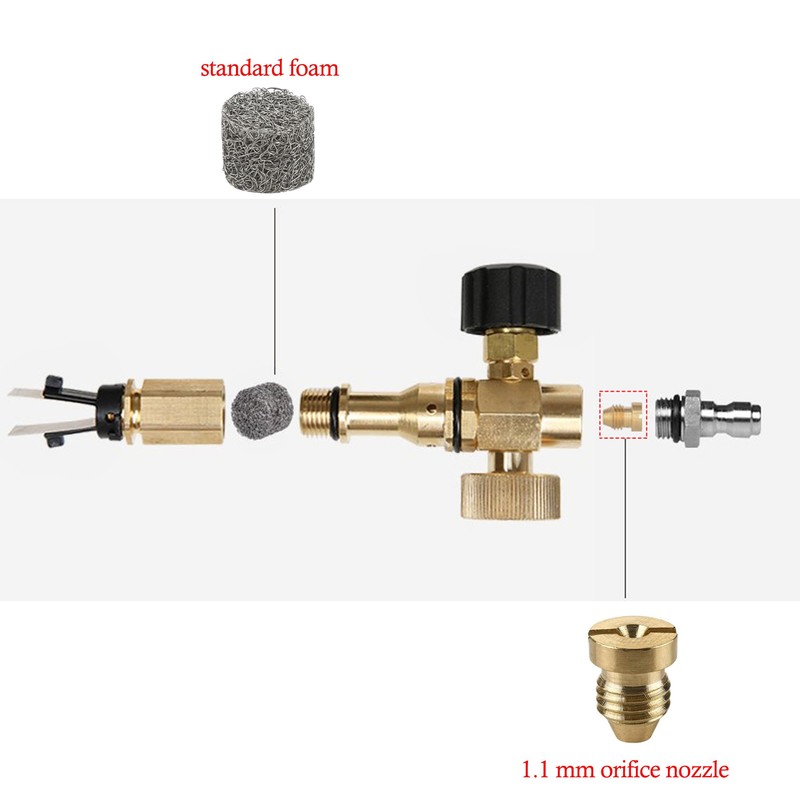 - Foam Cannon Orifice 1.1mm: Orifice Size 1.1 mm, Male NPT screw fitting, about 1/4 inch. The maximum working pressure: 3000 PSI. Made of stainless steel.