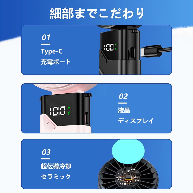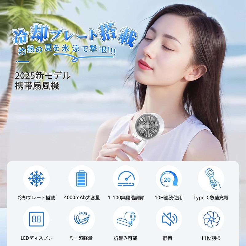 ハンディファン 携帯扇風機 手持ち扇風機 冷却プレート付き 1秒冷感 100段階パワフル風量 首掛け/卓上/手持ち 90°折り畳み Type-C急速充電 ...