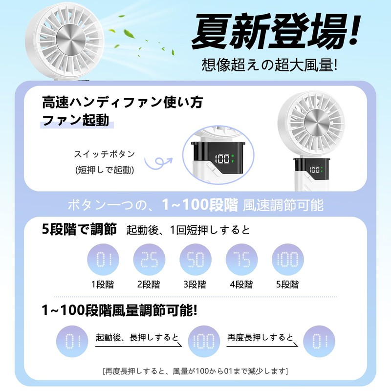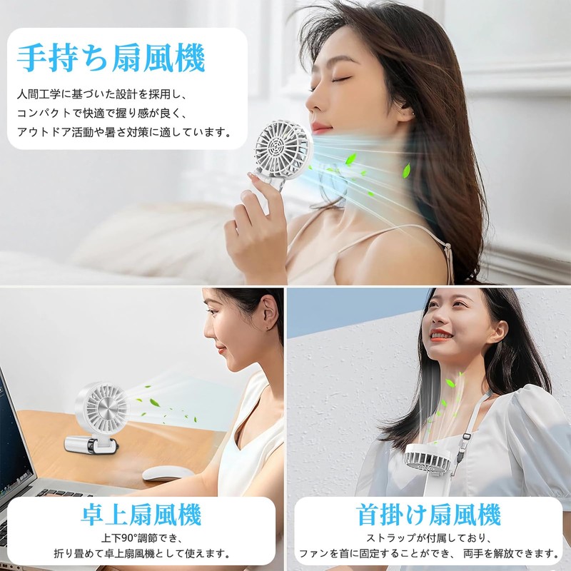 ハンディファン 携帯扇風機 手持ち扇風機 冷却プレート付き 1秒冷感 100段階パワフル風量 首掛け/卓上/手持ち 90°折り畳み Type-C急速充電 強力 大風量 静音 携帯便利 涼しい 熱中症対策 オフィス/通勤通学/花火大会用 ストラップ付き(ホワイト)