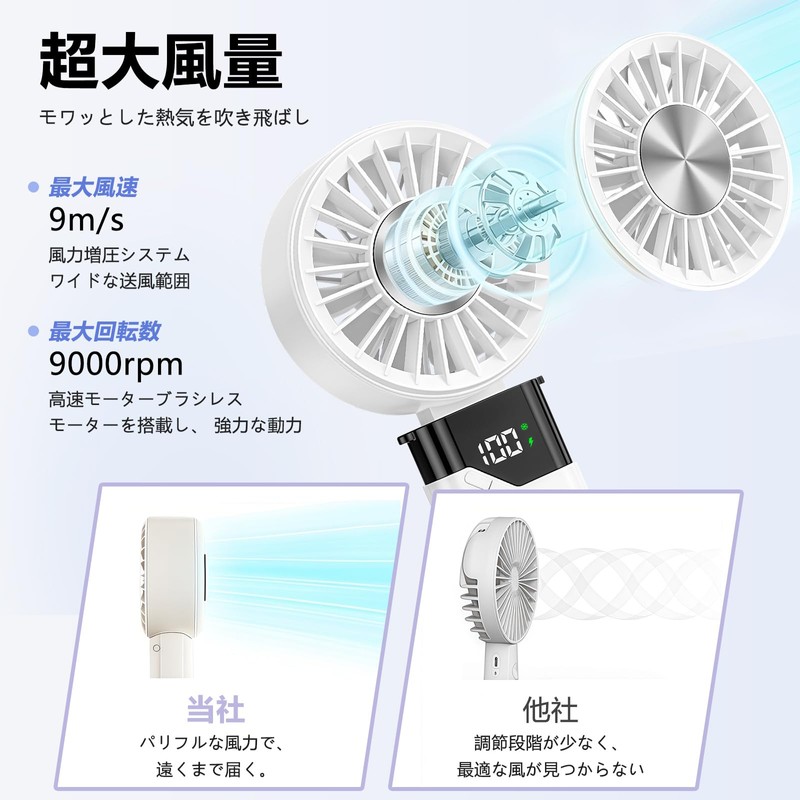 • 【100段階のパワフル風量】この携帯型扇風機はブラシレスモーターを採用しています。ターボ機能により従来比50%増の強力な冷風を送り出し、熱気を素早く冷やします。1~100段階の精密な風量調節が可能で、微風から強風までお好みに合わせて自由に設定できます。起動後わずか1秒ほどで、体感約-17度の冷たさを感じられるハンディファン 冷却ブレ一トので今年の夏はヒンヤリ涼しくお出かけしましょう!肌に触れた瞬間、まるで冷えた缶ジュ一スを押し当てたような涼しさを感じられます。Type-C急速充電なら2時間で満充電、弱風モードで連続10時間稼働可能。