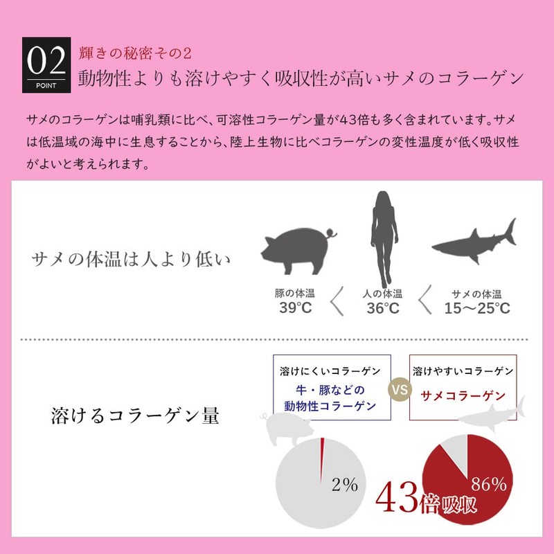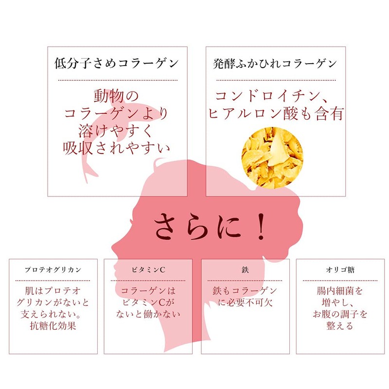 - 低分子さめコラーゲン、発酵ふかひれコラーゲン配合。コンドロイチン、ヒアルロン酸も含有