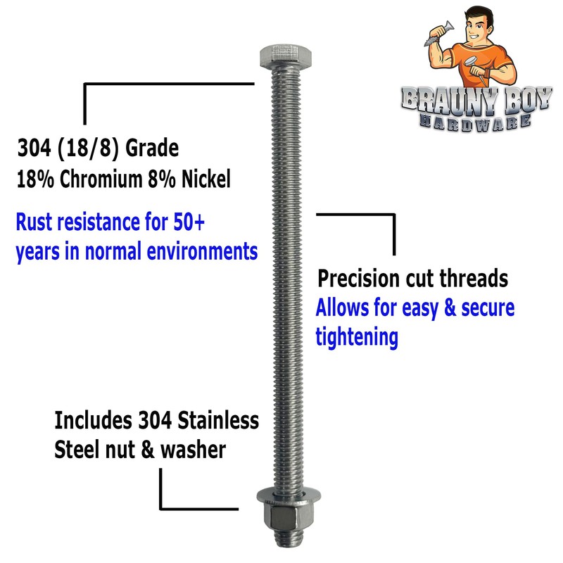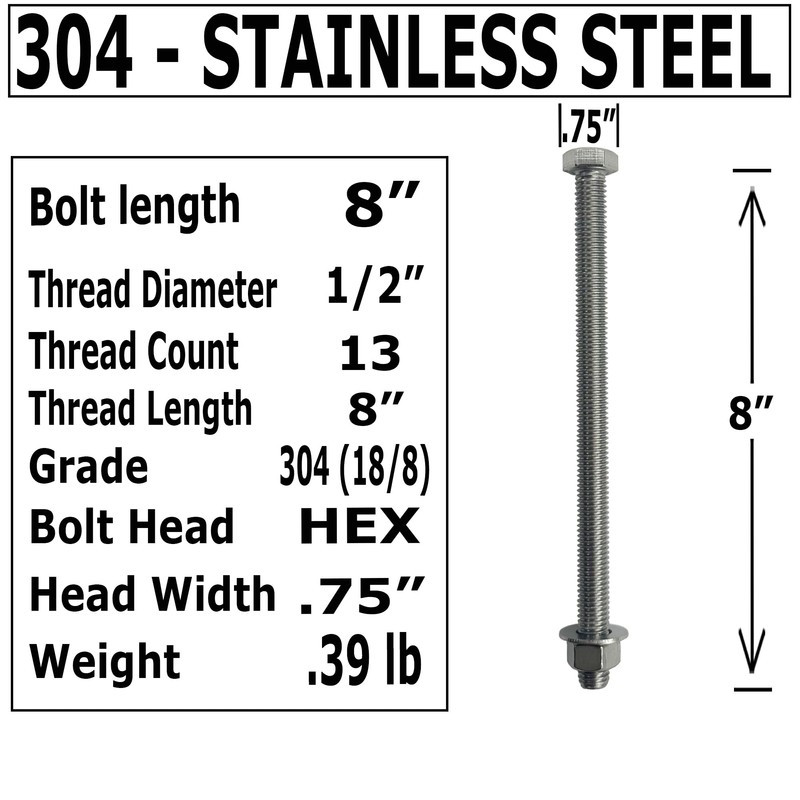 - 1/2"-16 x 8" - 304 Grade Stainless Steel Bolts