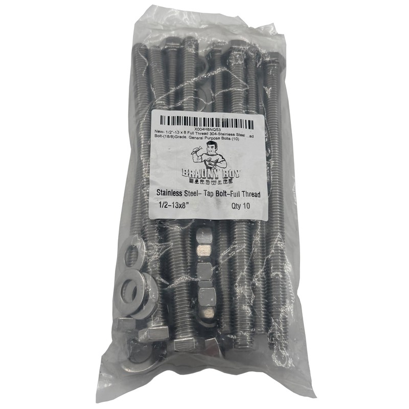 1/2"-13 x 8 Full Thread 304-Stainless Steel Bolts, Nuts & washers - Hex Head Bolt - (18/8) Grade. General Purpose Bolts (10)