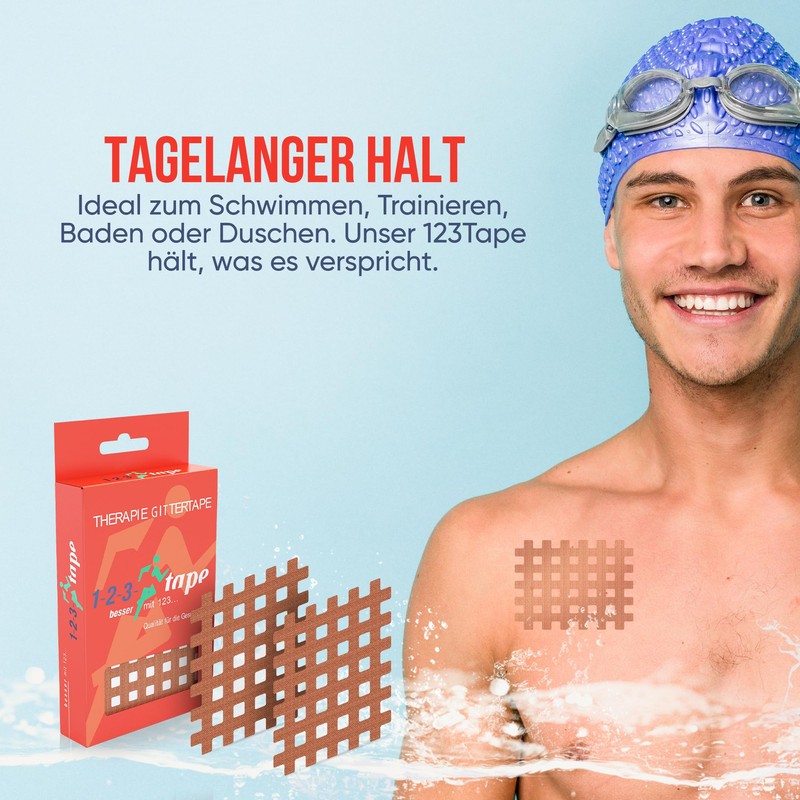 - Langanhaltender Halt: Das 123Tape Gittertape ist wasserfest und äußerst belastbar. Sie können es problemlos beim Duschen, Baden oder Sport tragen, ohne dass es seine Haftkraft verliert. Verlassen Sie sich auf einen zuverlässigen und langanhaltenden Halt.