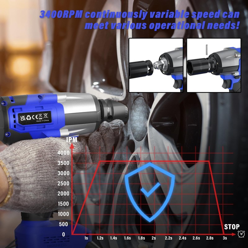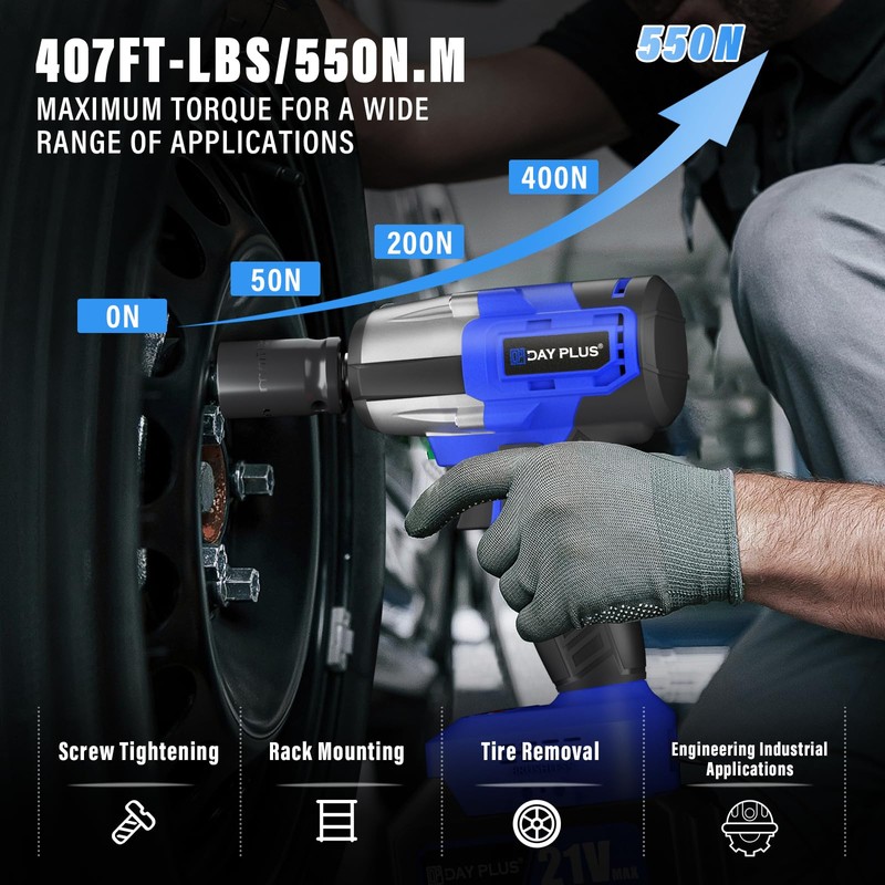 - 【High Quality & Efficiency】The cordless impact wrench adopts an all aluminum machine head tungsten steel shaft, with high hardness, high melting point, durability and impact resistance. The electric impact gun is 550 NM powerful torque (equal to 406 ft lbs), 3400 RPM continuously variable speed, adjustable according to work needs, equipped with various high-quality accessories for different situations, effectively completing difficult tasks, and meeting industrial grade work requirements!
