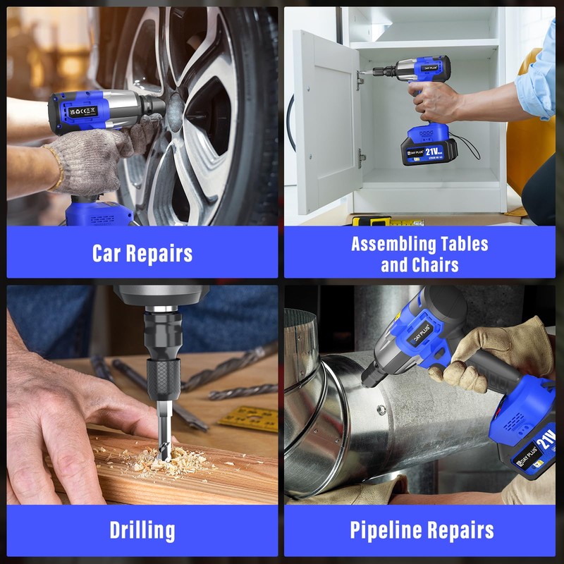 - 【Widely Used】The cordless impact wrench can be used for car maintenance, commercial machine maintenance, tire installation and dismantling, scaffolding installation and dismantling, elastic screws, wooden board drilling, metal drilling, furniture assembly, etc. Electric wrenches are effective in preventing water, dust, and falling, suitable for harsh working conditions, and can be used in different scenarios. One machine in hand, worry free throughout!