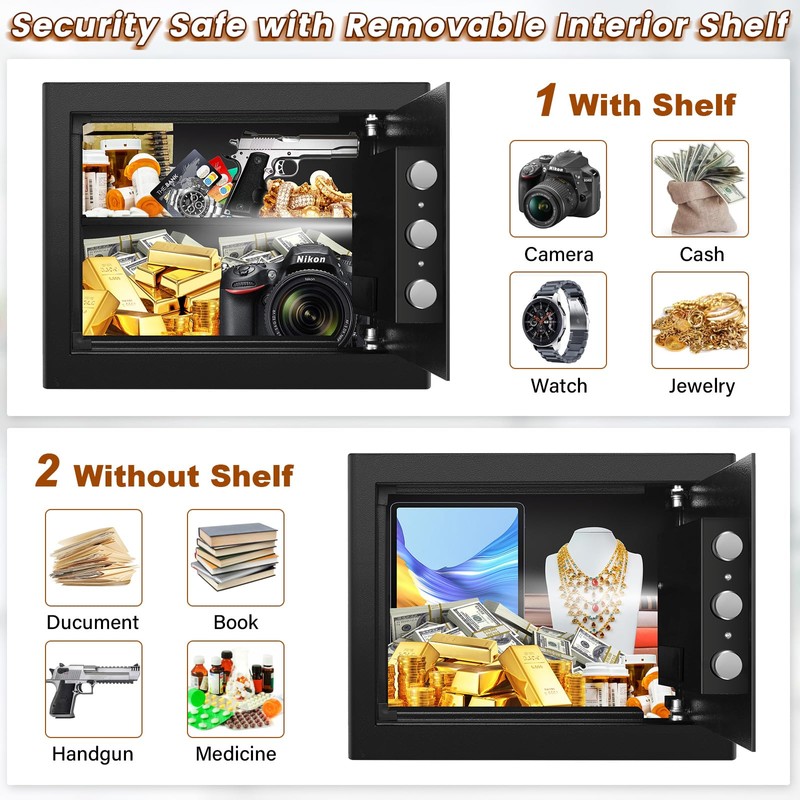 - REMOVABLE SHELF & SENSOR LIGHT: The removable shelf can help you organize important items easily, and you can take it in or take it out according to your needs. The built-in sensor light that automatically turns on when the safe box is opened, providing illumination in low-light conditions