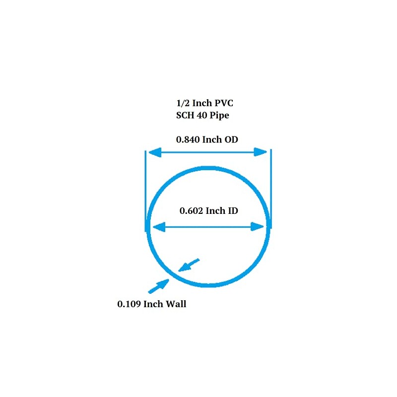 - Pipe ID is not exactly 1/2 inch. Pipe has approx. ID of 0.602 inch and approx. OD of 0.840 inch as specified by PVC SCH40 specs.