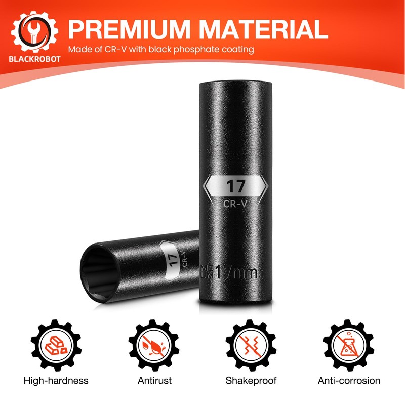 - PREMIUM COATING:Deep impact socket 's surface is covered with black phosphate, which can resist corrosion, rust and wear