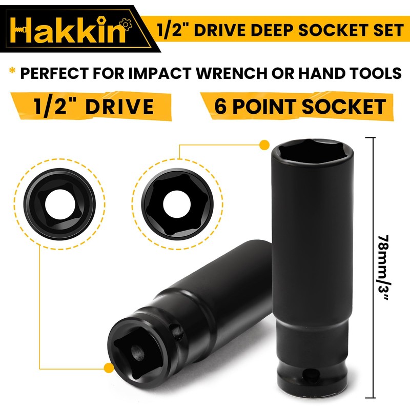 - 【Durable & Impact Grade】Hakkin Impact Grade Socket Set is made of heat treated Chrome Vanadium Steel with high hardness and toughness, and it is finished with a black electrophoretic corrosion resistant coating.