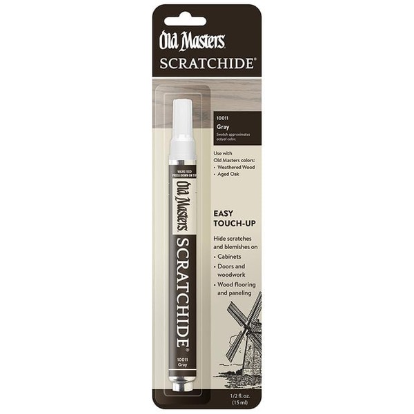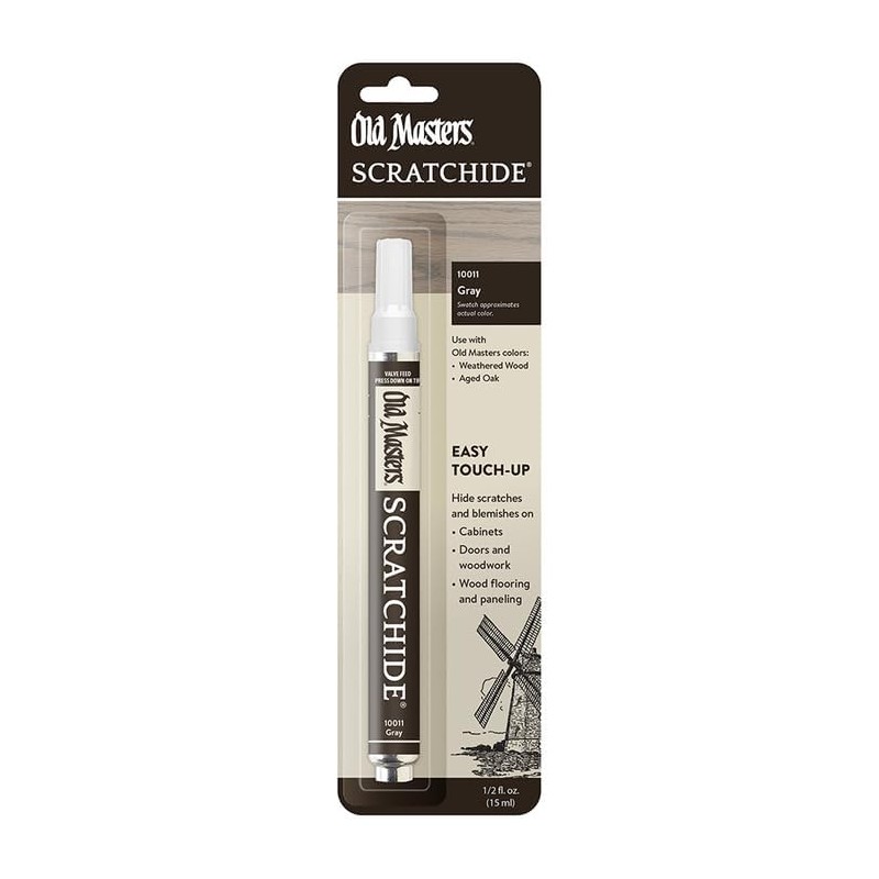 Old Masters Scratchide touch-up pen will disguise unsightly scratches on doors, woodwork, paneling, wood floors, kitchen cabinets, and more. The pen is formulated to repair your wood projects quickly and easily in one step. Wipe it off quickly to obtain lighter colors or leave it on longer to obtain darker colors. Choose from ten popular colors.