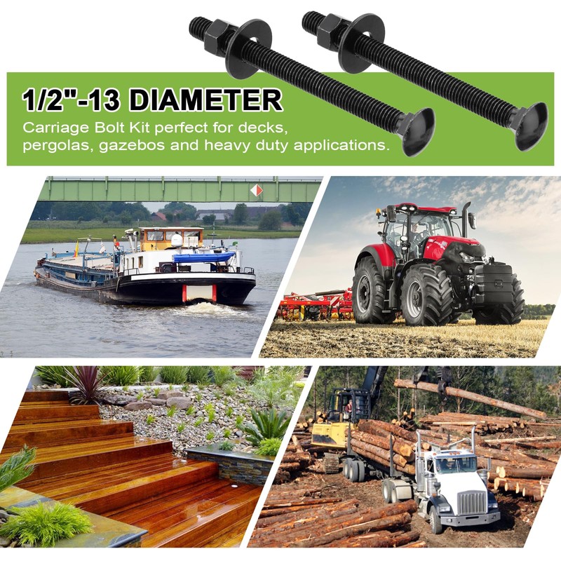 - Carriage Bolt Kit perfect for decks, pergolas, gazebos and heavy duty applications. 1/2"-13 diameter