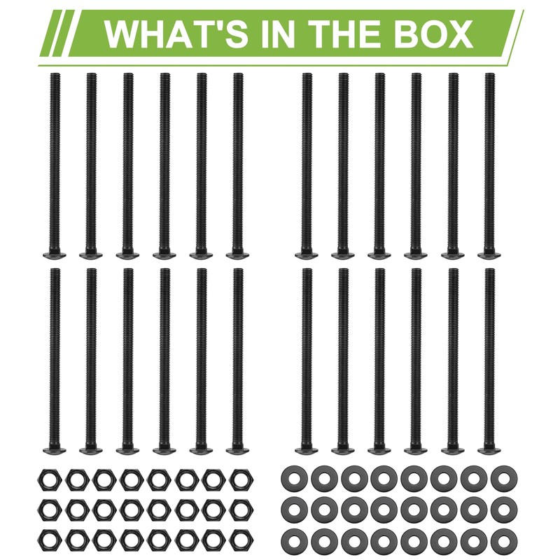 - Carriage Bolt Kit: Includes 24 carriage bolts, 24 USS thick washers, 24 hex nuts