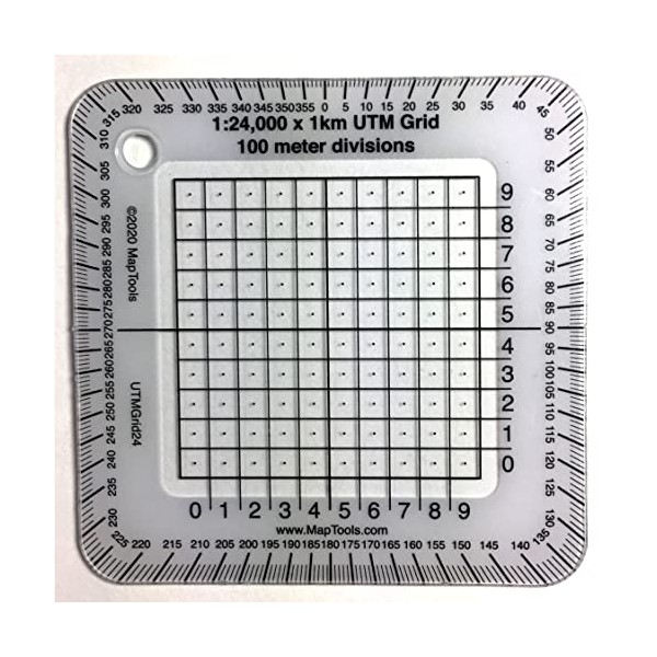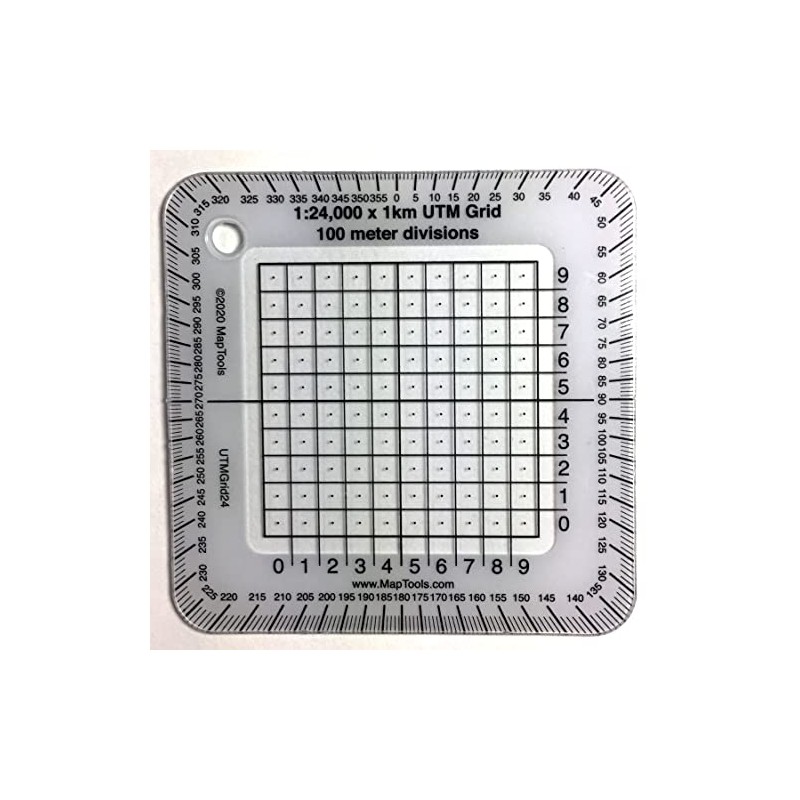 1:24,000 Scale "Pocket Sized" UTM Grid Overlays Fast and easy UTM plotting These easy to use grid tools divide a 1 kilometer grid square into 100 meter squares. Align the tool on the map grid and read off the easting and northing values. The tools also have a compass rose along their outside edge. This makes plotting or measuring a bearing a snap. The small size of these tools will allow you to keep them handy in your pocket. A band of white ink around the edge makes reading the compass rose and grid numbers easier and also keeps the tool from "disappearing" when you place it on the map. In the center of each 100m square a small dot, makes it easy to read the coordinate with a 50m precision. There is a lanyard hole in the upper left corner. Printed on 30 mil plastic stock the tools are about the thickness of a credit card. The ink is coated to protect it from abrasion. Size 2.75" x 2.75" (7cm X 7cm).
