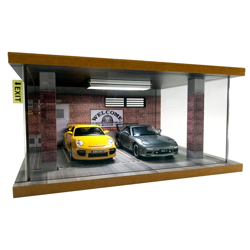 1/24 Scale Die-cast Car Garage Display Case with Clear Acrylic Cover and LED Lighting for 2 Parking Space (Route 66)