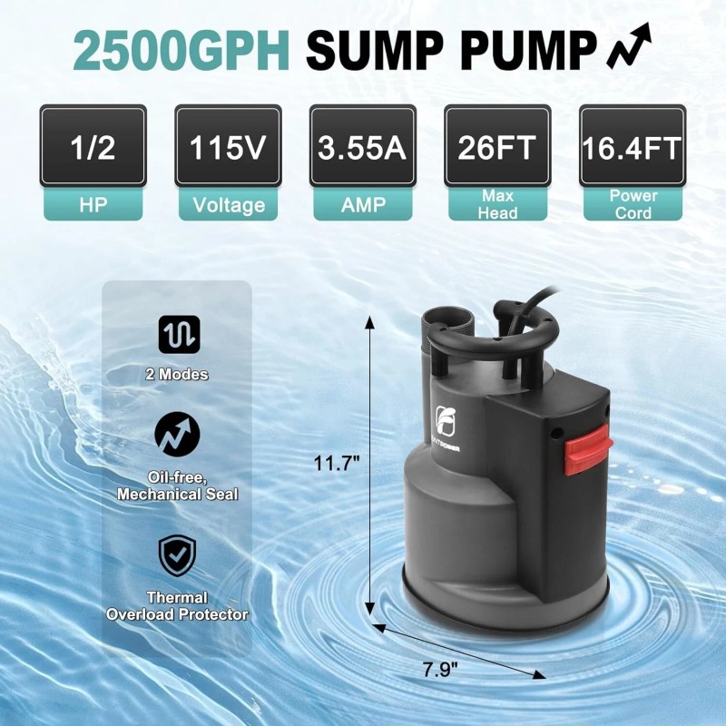 1/2HP Submersible Sump Pump 2500GPH Utility Water Pump, Auto/Manual Control b...