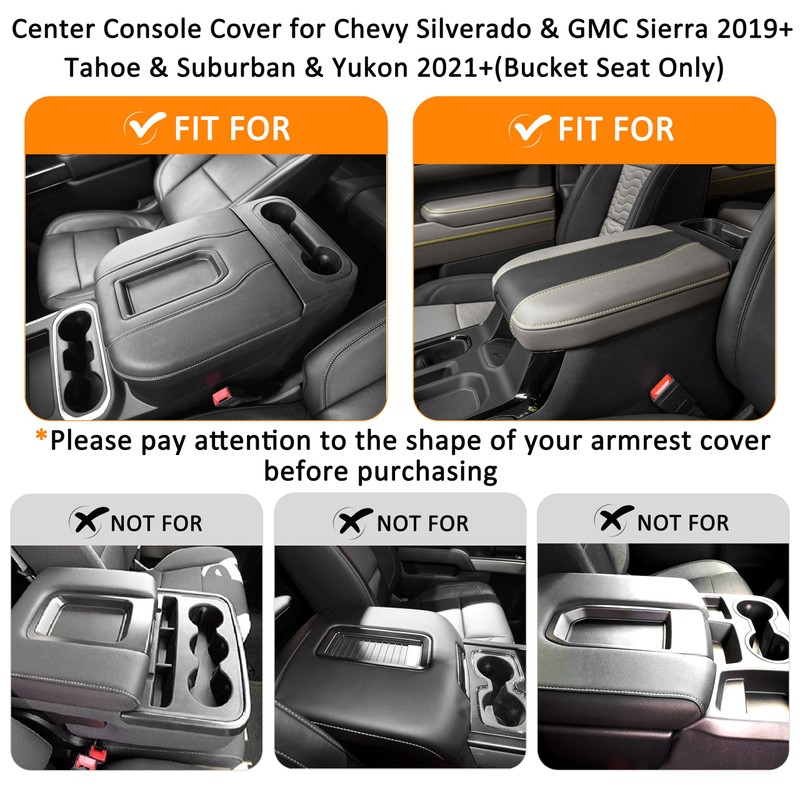 - [PERFECT FIT]: The center console cover is perfect for 2019 2020 2021 2022 2023 2024 2025 Chevy Chevrolet Silverado & GMC Sierra 1500 2500HD 3500HD, 2021 2022 2023 2024 2025 Chevy Tahoe & Suburban & GMC Yukon (NOTE: ONLY for Bucket Seat Consoles, NOT FOR Split Bench Jump Seat)