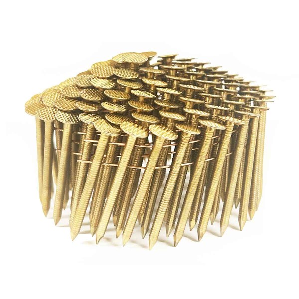 Our Coil Roofing Nails are manufactured according to the roofing industry specifications. These nails are 1-3/4" length 15 degree wire collated with a head diameter of .375" (3/8" diam) Made of .120" (11 gauge) RING shank Electro Galvanized steel. Electro Galvanized steel provides a very thin layer of coating with a measure of protection against the elements. Over time these nails may corrode. Ring shank nails, also known as annular thread, offer superior holding power and helps prevent nails from backing out over time. Commonly used in composition asphalt shingles applications. Not recommended for ACQ Treated Lumber. Each Box contains approximately 7,200 nails.Applications Include:Asphalt and fiberglass shingles for both new roofs and reroofing. Also for attaching waterproof tar paper, roofing felt, metal drip edges, insulation board, cementitious fiber board products and vinyl siding.