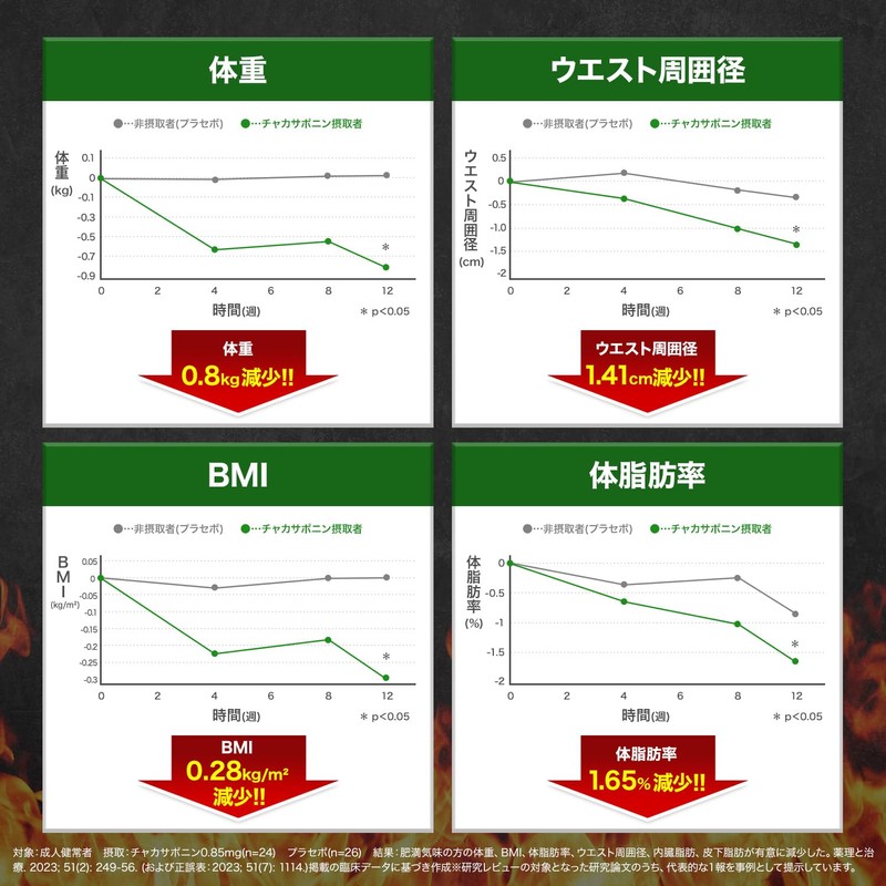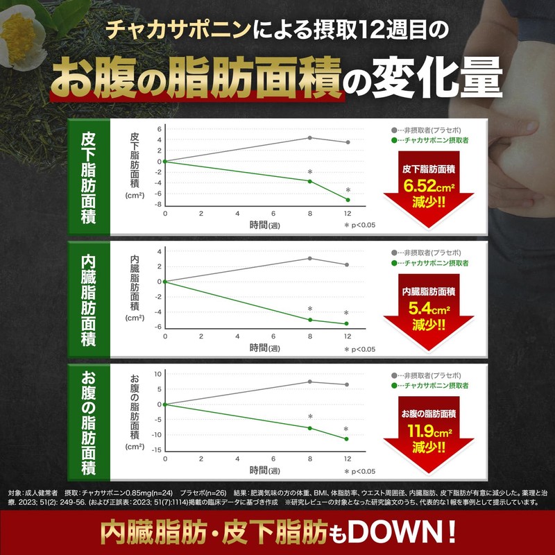- 【機能性表示】本品にはチャカサポニンが含まれます。チャカサポニンには、食事に含まれる脂肪の吸収を抑えて、食後の血中中性脂肪の上昇を抑える機能があることが報告されています。また、肥満気味な方の体脂肪、お腹の脂肪(内臓脂肪、皮下脂肪)、ウエスト周囲径、体重の減少をサポートすることで、高めのBMIを改善させる機能が報告されています。(届出番号:J388)