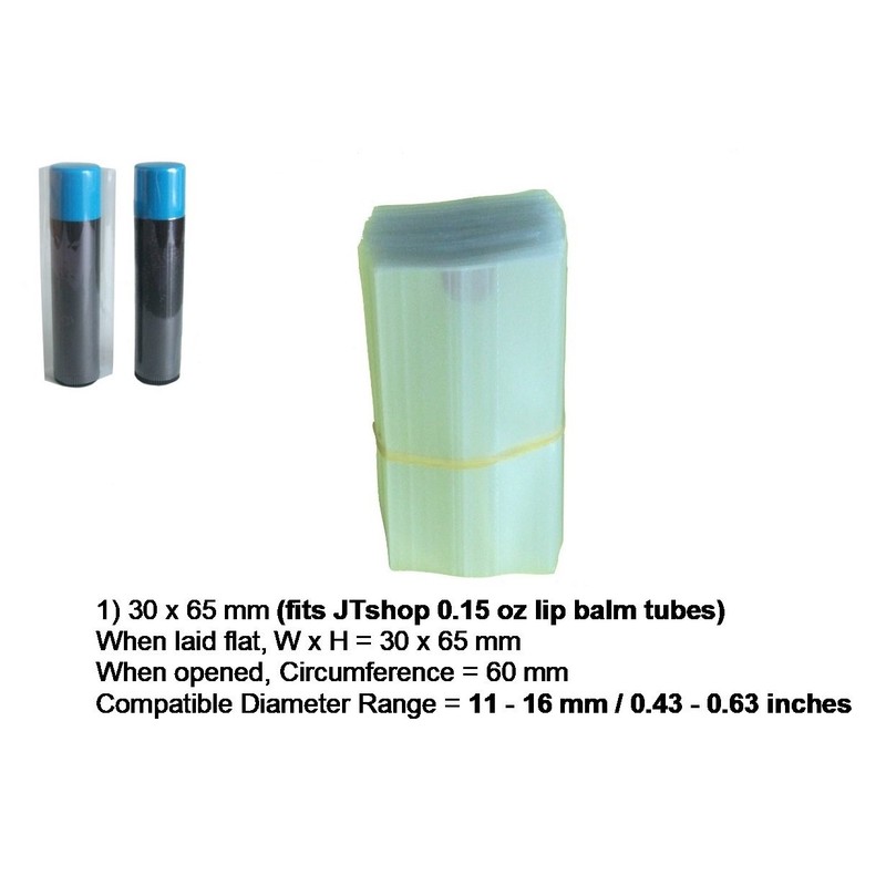 - 1) 30 x 65 mm (fits JTshop 0.15 oz lip balm tubes) WHEN laid flat, W x H = 30 x 65 mm WHEN opened, Circumference = 60mm. Compatible Diameter Range = 11-16 mm / 0.43-0.63 inches