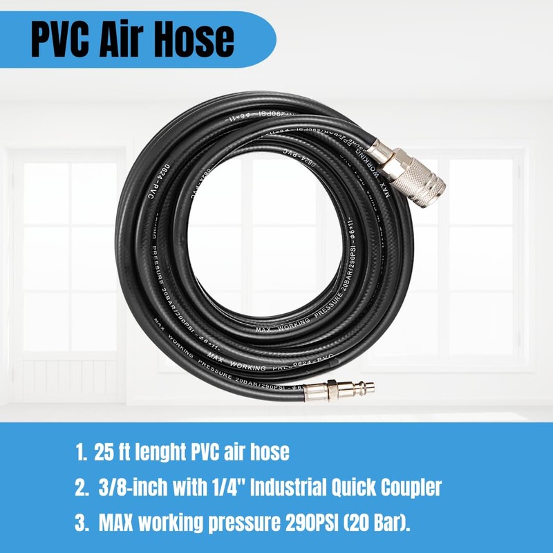 • 3/8" 25 ft PVC air hose with max working pressue of 290Psi