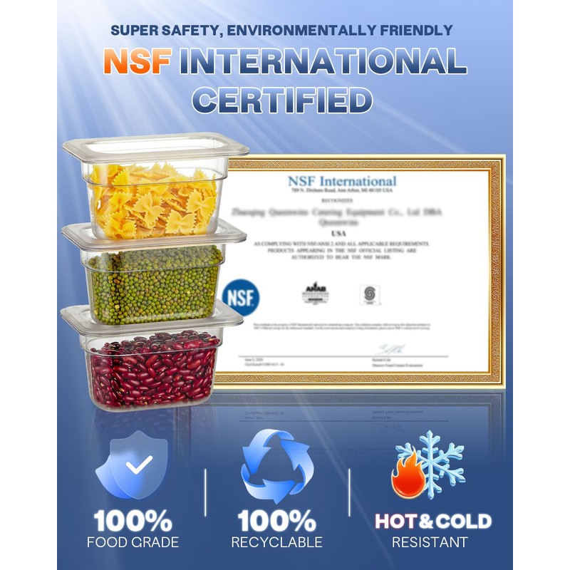- [AUTHORITATIVE NSF CERTIFICATION]:1/4-Size Commercial Food Pan with Lids(10 1/2''* 6 1/2'' * 2.5''- 1.8QT) is NSF certified, ensuring that it does not contain any BPA substances and can be safely used for food storage. It is used in temperatures ranging from -40 degrees Fahrenheit to 250 degrees Fahrenheit, suitable for both cold and hot usage.