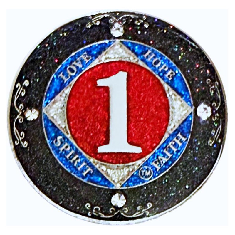 (1-50 Years) NA 1 Year Narcotics Anonymous Medallion, Red, white (Metallic Tone), and blue Recovery Coin – Narcotics Anonymous Recovery, Clear Crystals, Red, Silver, Blue & Black Rainbow Glitter